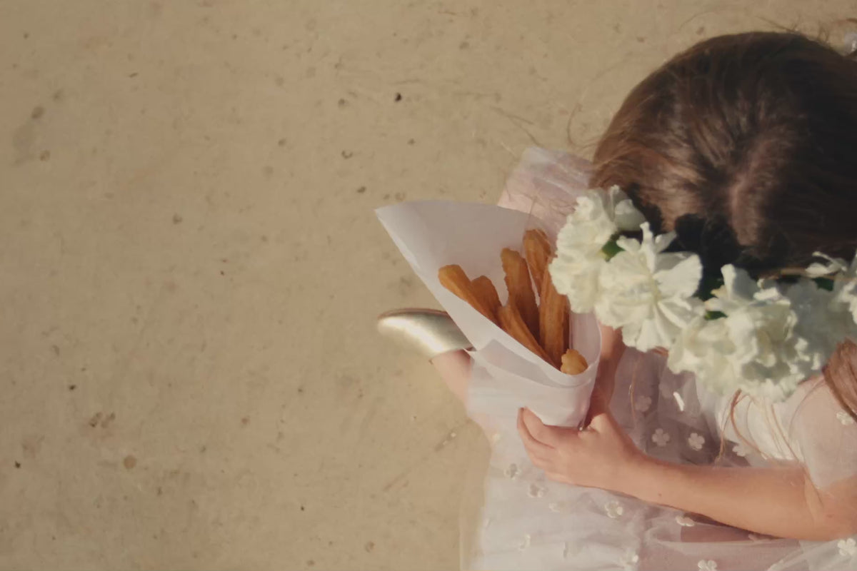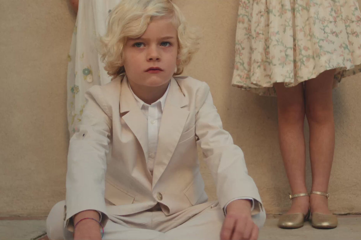 In the heart of the city, gardens and secret passageways become a haven of softness. A procession of children awaits the celebration: some grow bored, others keep busy, tending to their impeccable outfits with care. Dressed in white, ivory, pale pink, and soft green, their silhouettes shine with freshness, precious glimmers in a suspended moment.