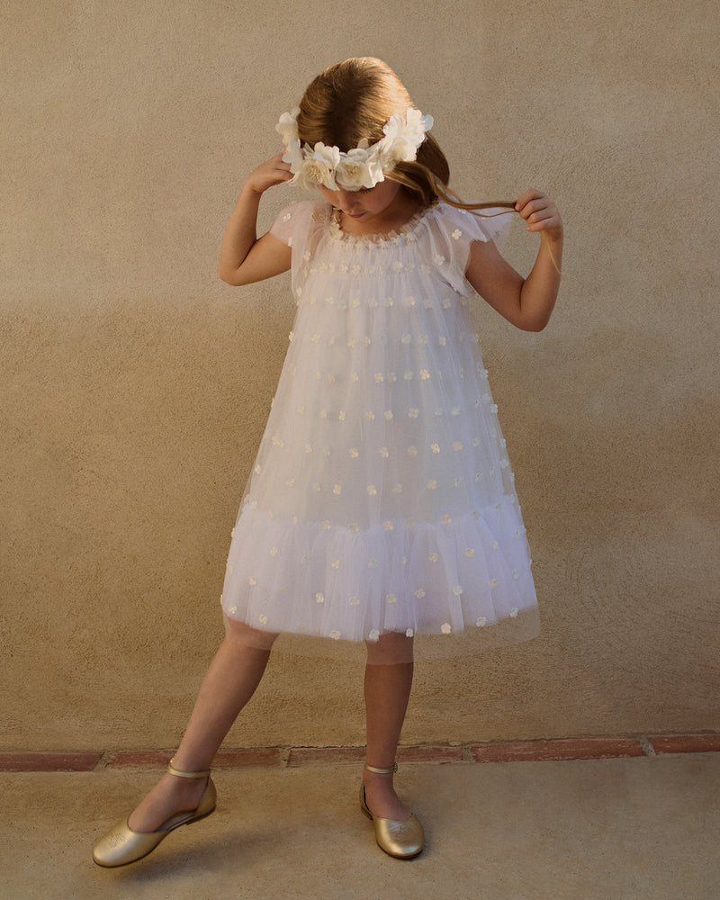 This Joana dress for girls combines comfort and style with a romantic vibe. It features a fresh floral motif, with a wide ruffled collar enhanced by light gathering adding to its charm. Made from cotton, it has an organic cotton lining for optimal comfort and a button tab at the neckline for a practical touch