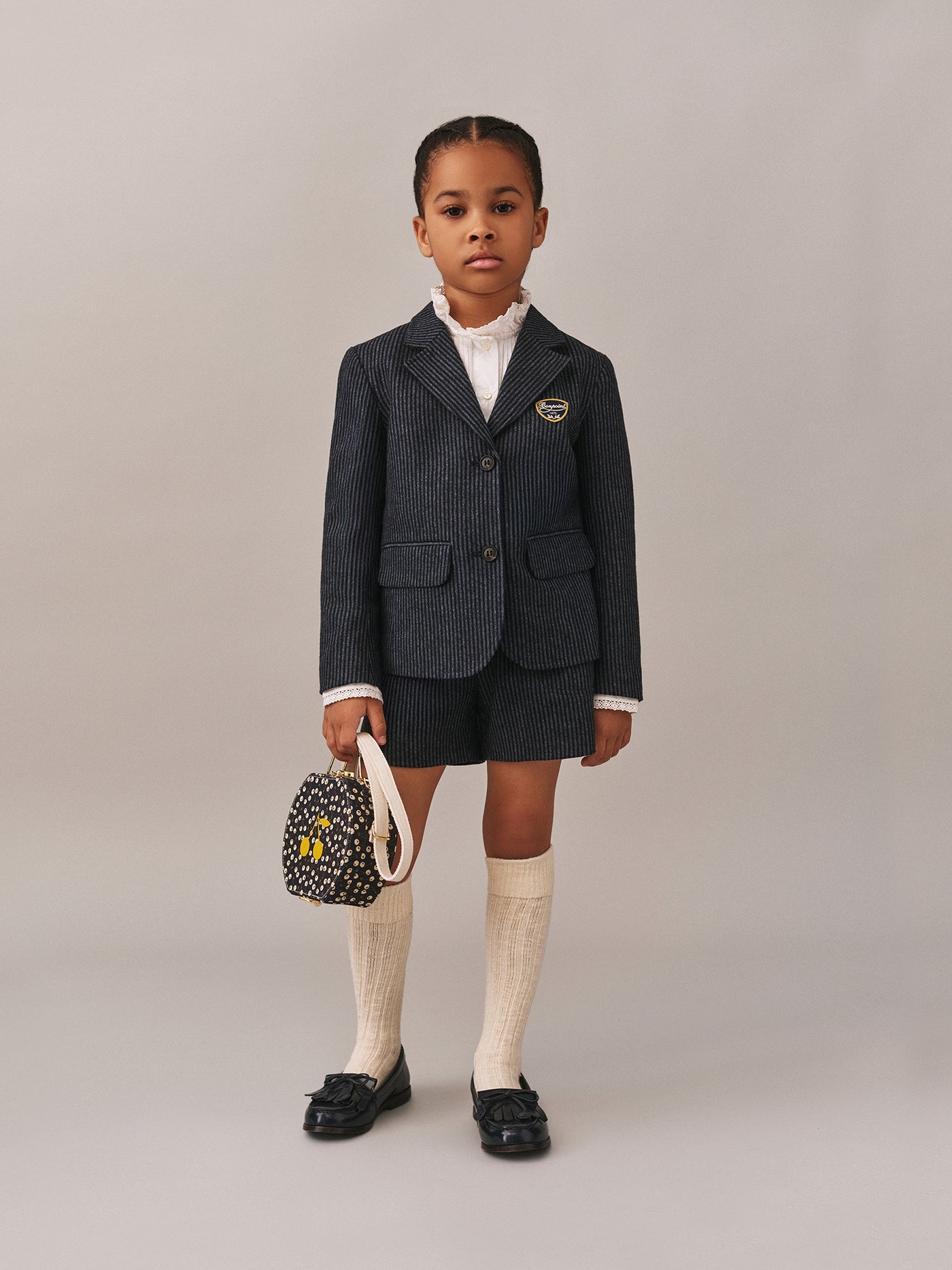 The Jolene skirt for girls features a short cut, structured by elegant pleats. The waistband is adjustable with a button and decorated with a tone-on-tone embroidered cherry.