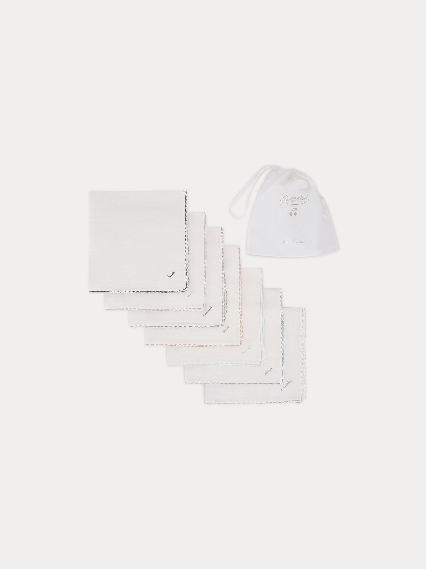 Baby will discover new tastes day after day with this set of embroidered bibs. They are made of ribbed cotton and each has a different colored trim and a delicate embroidery for every day of the week.